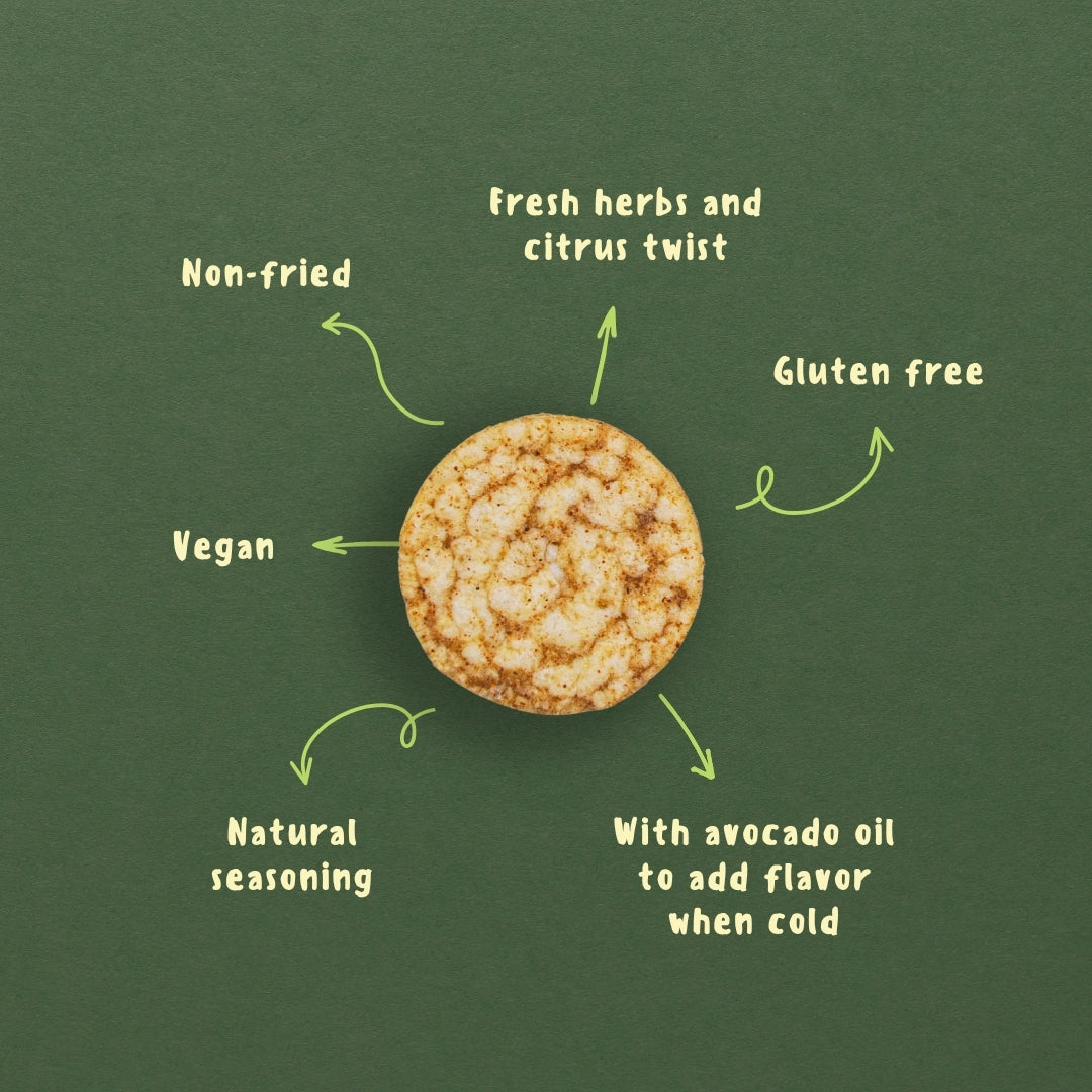 Meet your new favorite savory snack. Our Herbs & Lime Rice Cakes are made from just a few simple, real ingredients you actually know—like popped whole grain rice, avocado oil, and a zesty blend of lime, basil, and spices. That’s it.
