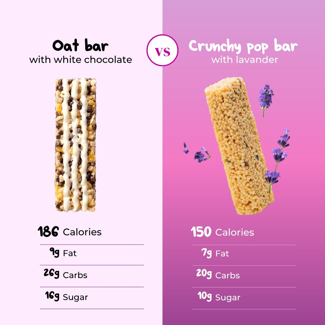 This crispy snack bar is coated in creamy white chocolate and melts in your mouth with a smooth, velvety texture. Infused with a hint of lavender, it offers a delicate floral note that brings calm and comfort in every bite—elevating your snack moment with elegance and balance.